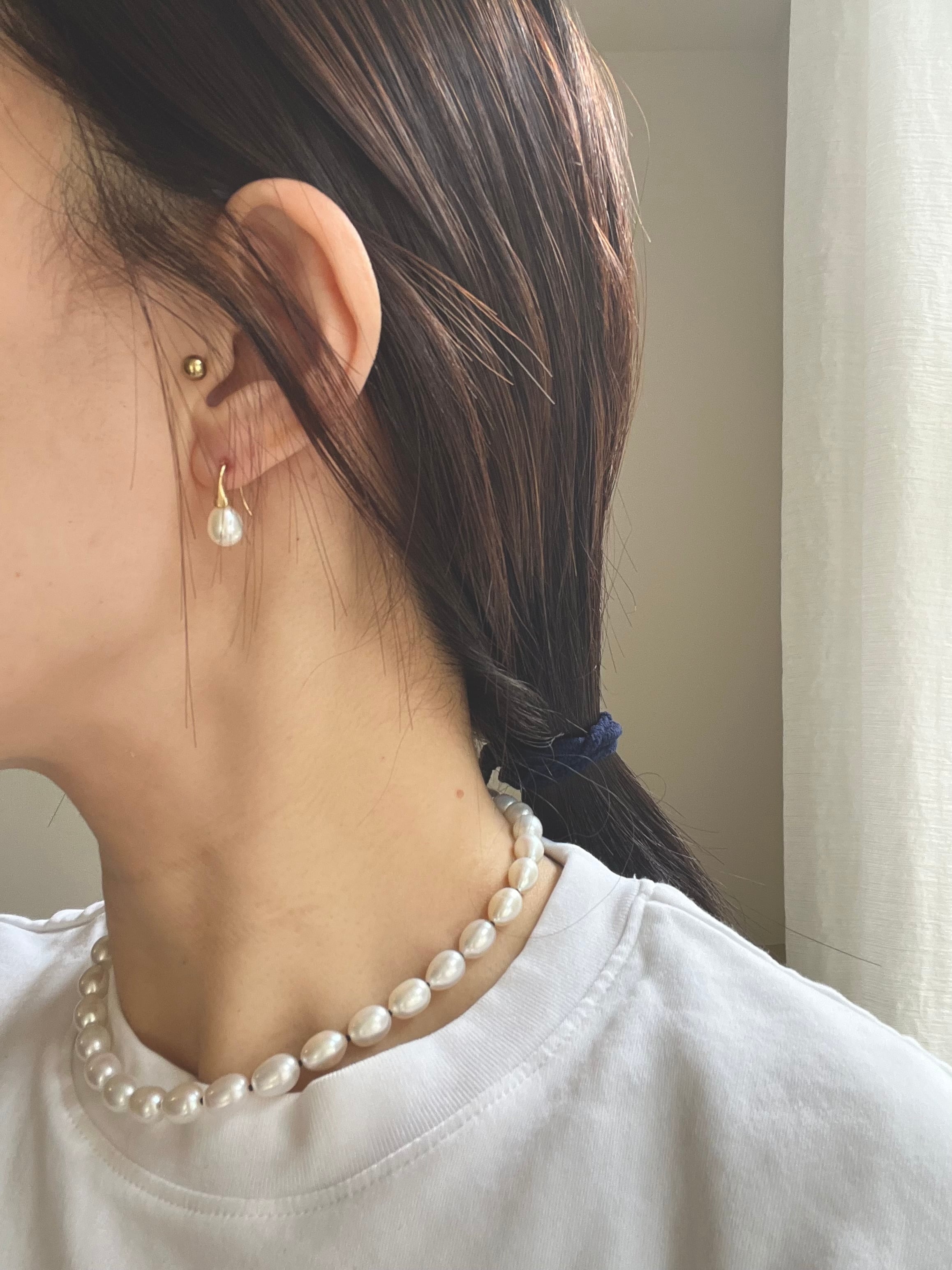 ワンタッチ式のBEANS型の金具はパールと同じサイズ感で肌に馴染み、ストレスフリーの付け心地です。