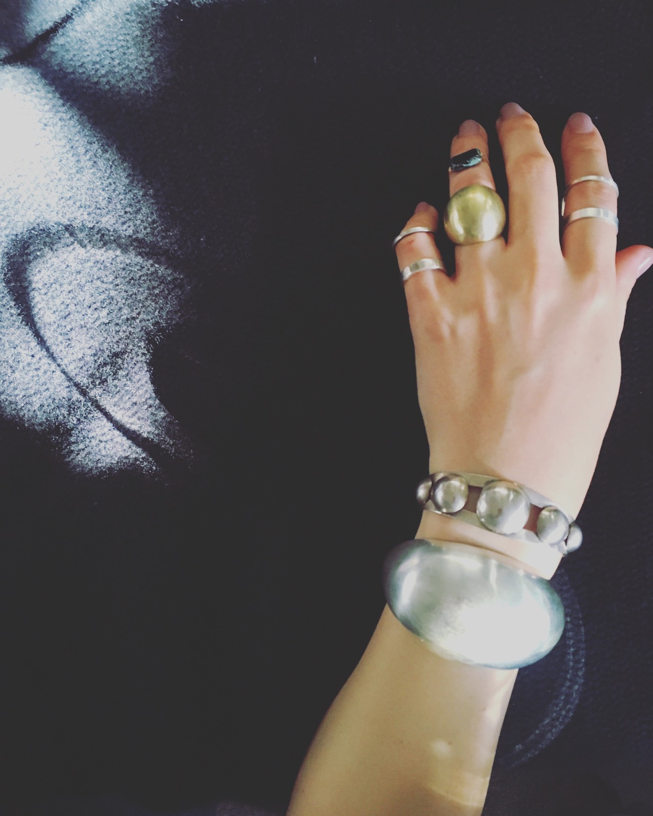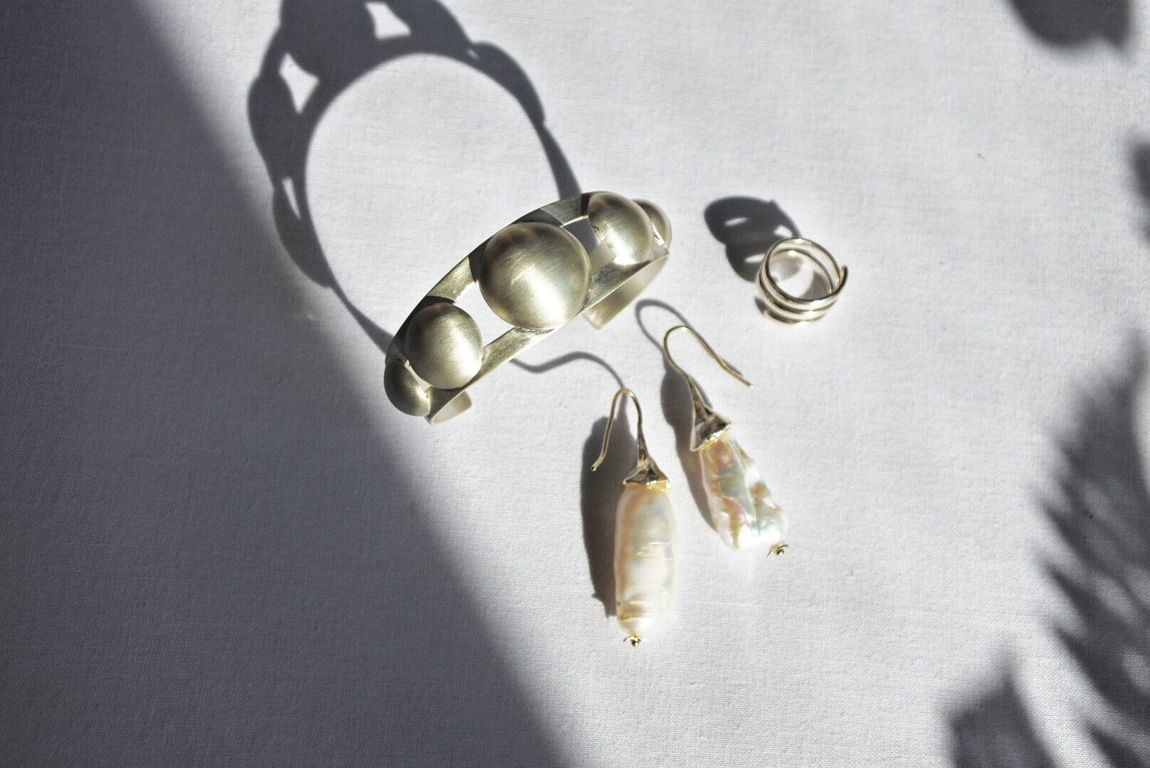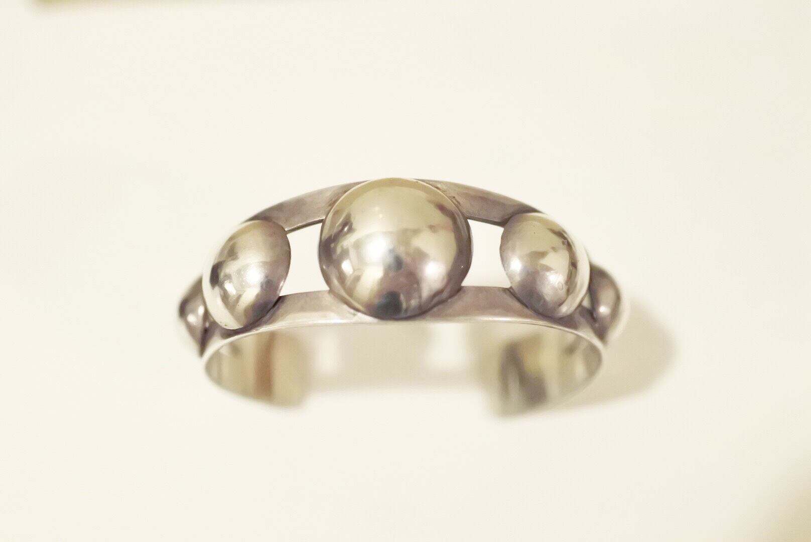 満月のような、ドームが沢山連なったデザインのバングル。ナバホ族のバングルデザインを元に当時流行ったフレッドハービースタイルにし、見た目よりも軽さを出しました。
